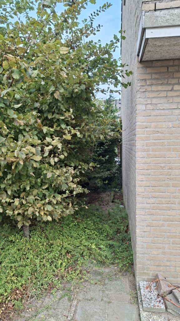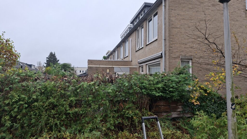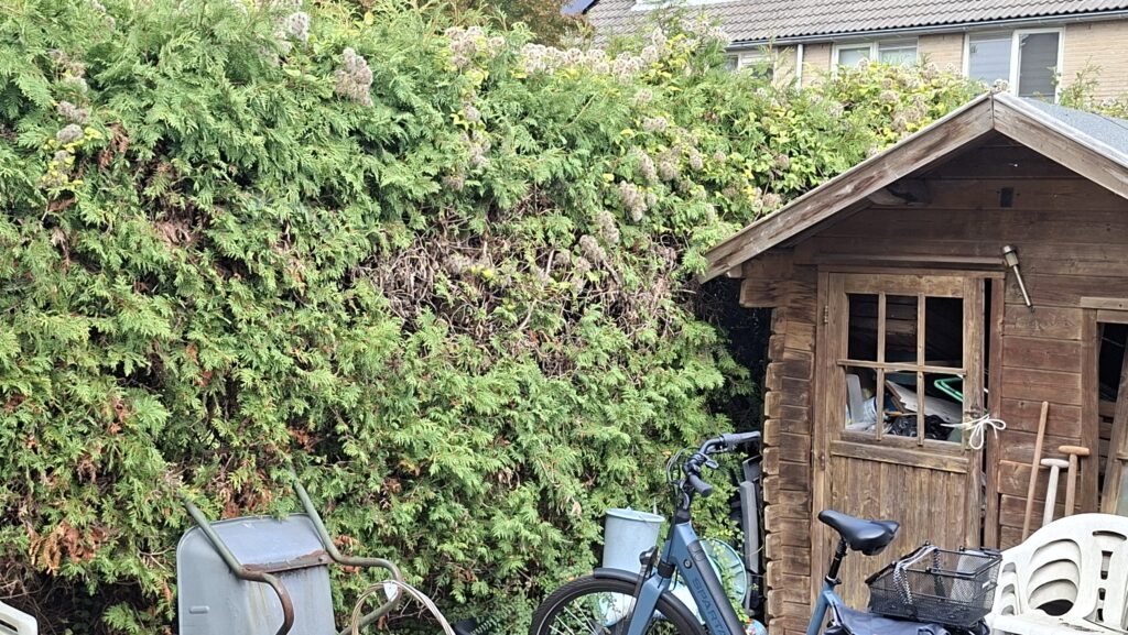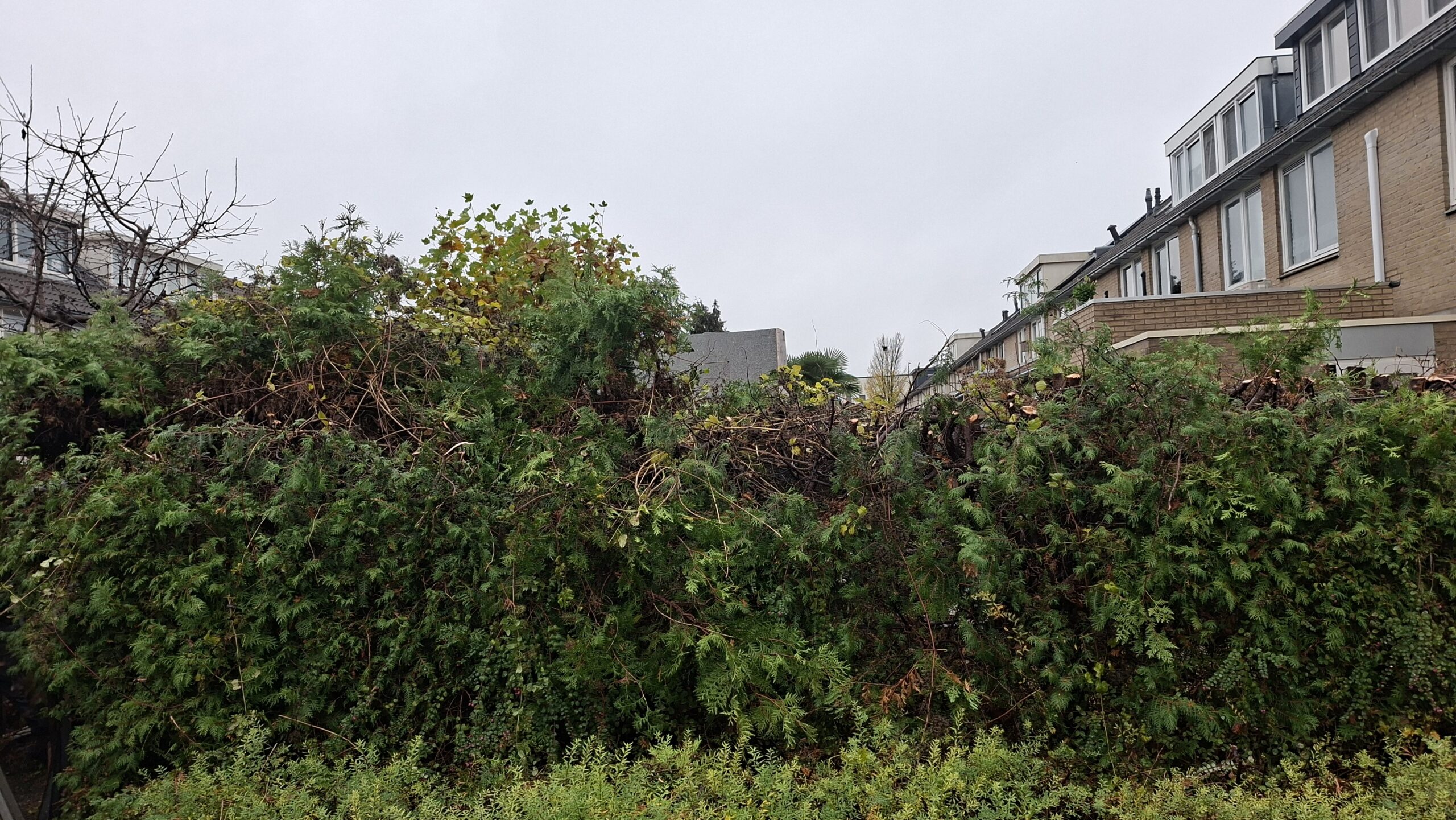 doorgehakt, de heg kortwieken, bedoel we kunnen er weer overheen kijken.