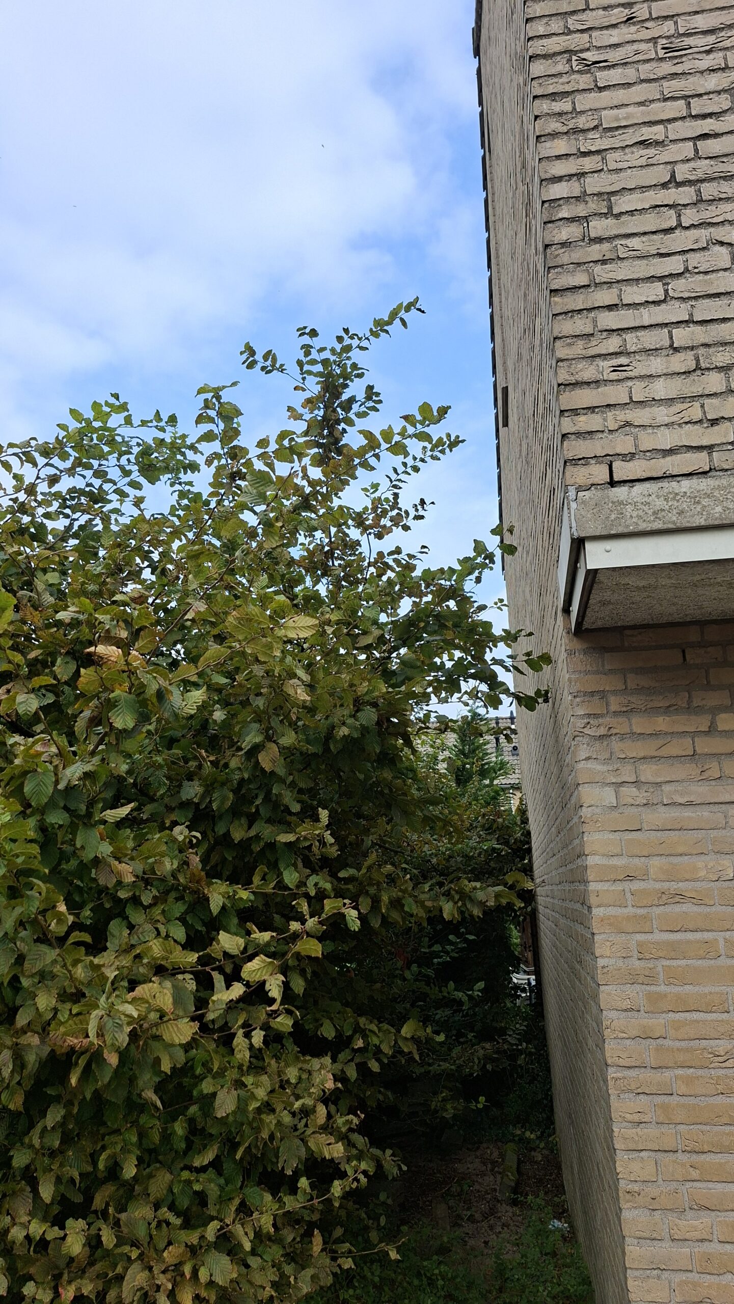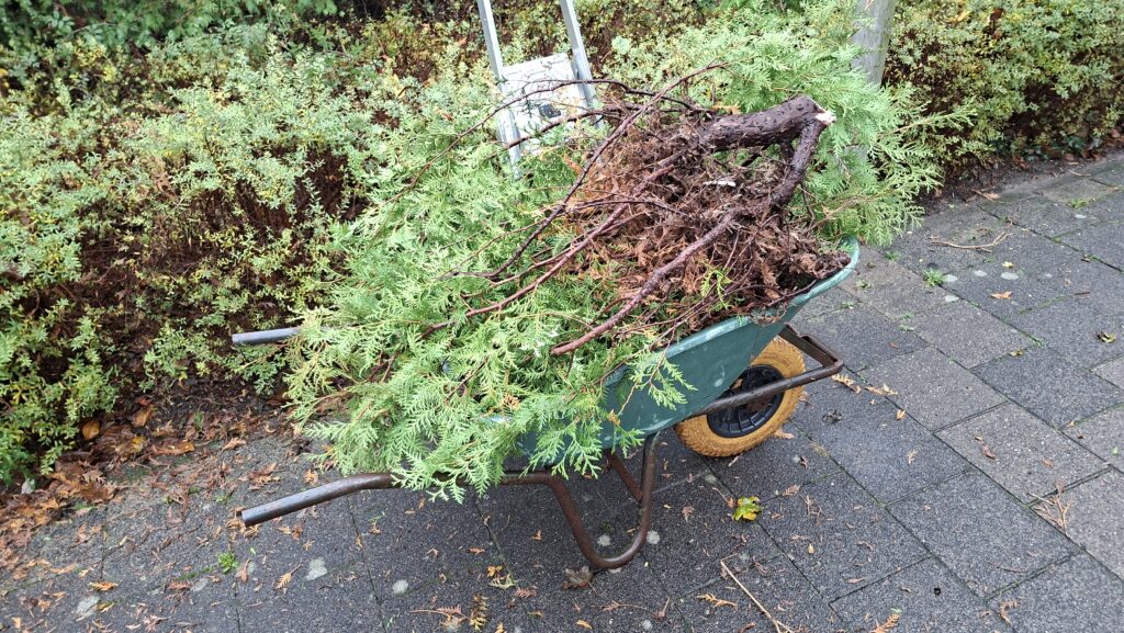 Dus vanmorgen kwam Boudewijn met hulp van zijn zoon ff met een kettingzaag langs en na een paar uur was de coniferenheg gekortwiekt en konden we er weer overheen kijken.